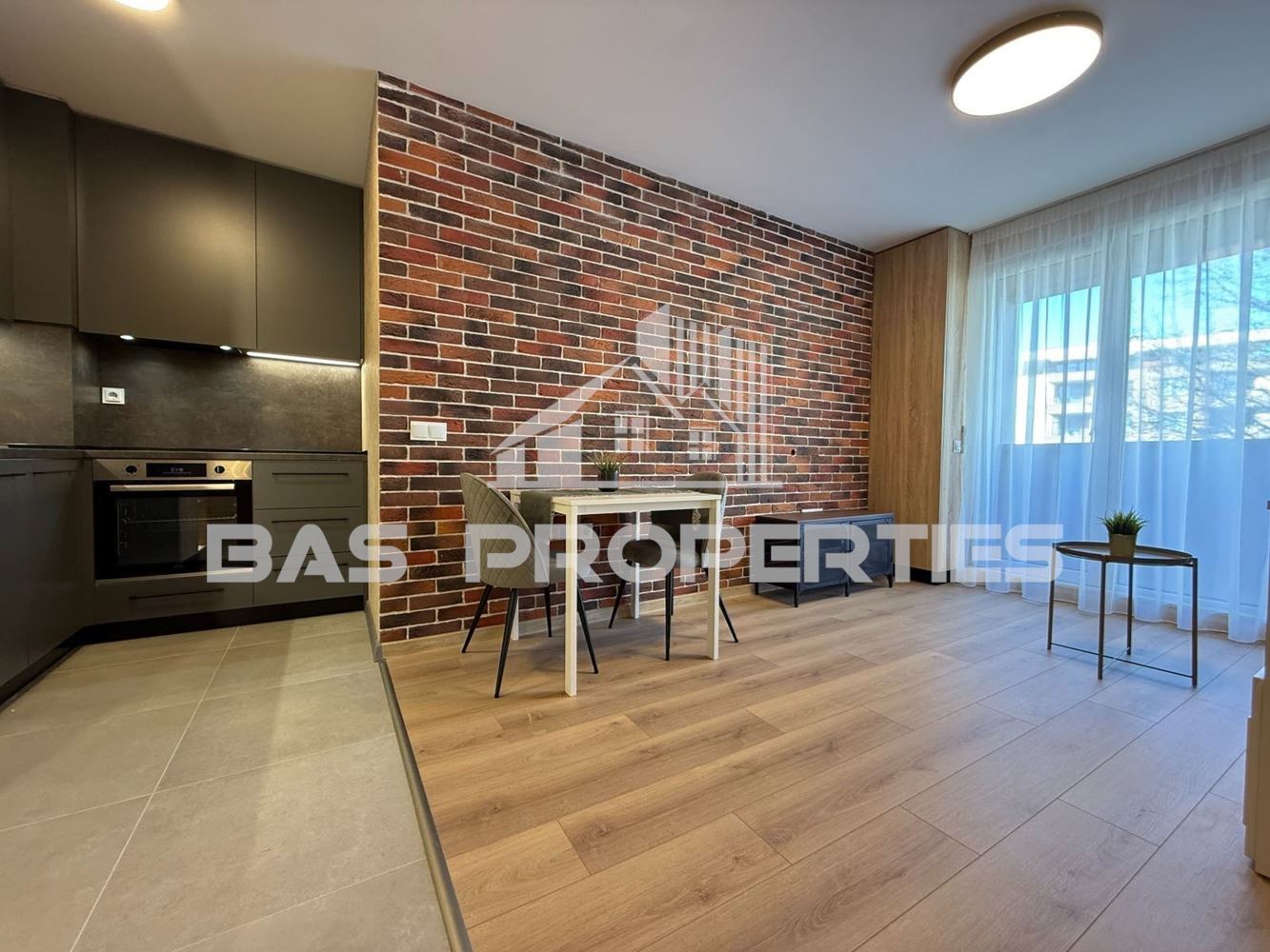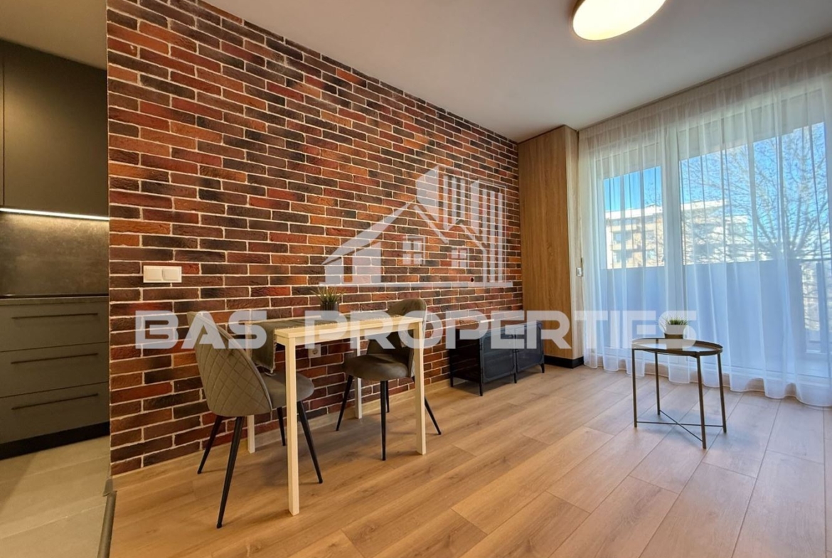 Пространството е добре организирано с обособени зони за кухненски бокс, трапезария и дневна част, което създава комфортна и модерна жилищна среда. Монтиран е нов климатик.